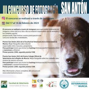 III Concurso de fotografía San Antón Con motivo de la festividad de San Antón, el Ilustre Colegio de Veterinarios de la Región de Murcia y la Facultad de Veterinaria de la UMU, presentan el III Concurso de Fotografía de San Antón. El concurso se realizará a través de la red social instagram (@veterinariosmurcia) para que