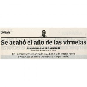 Christian de la Fe: “Se acabó el año de las viruelas” El pasado martes, nuestro compañero Christian de la Fe Rodríguez, catedrático de Sanidad Animal de la UMU, escribió un artículo para el periódico La Verdad en el que habla de que en el año 2022 han aparecido en España dos tipos de viruela que