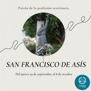 San Francisco de Asís 2022 Un año más, el Ilustre Colegio Oficial de Veterinarios de la Región de Murcia, celebra la festividad en honor al patrón de la veterinaria, San Francisco de Asís Desde el jueves 29 de septiembre hasta el sábado 8 de octubre se llevarán a acabo diversos actos, celebraciones y formaciones con